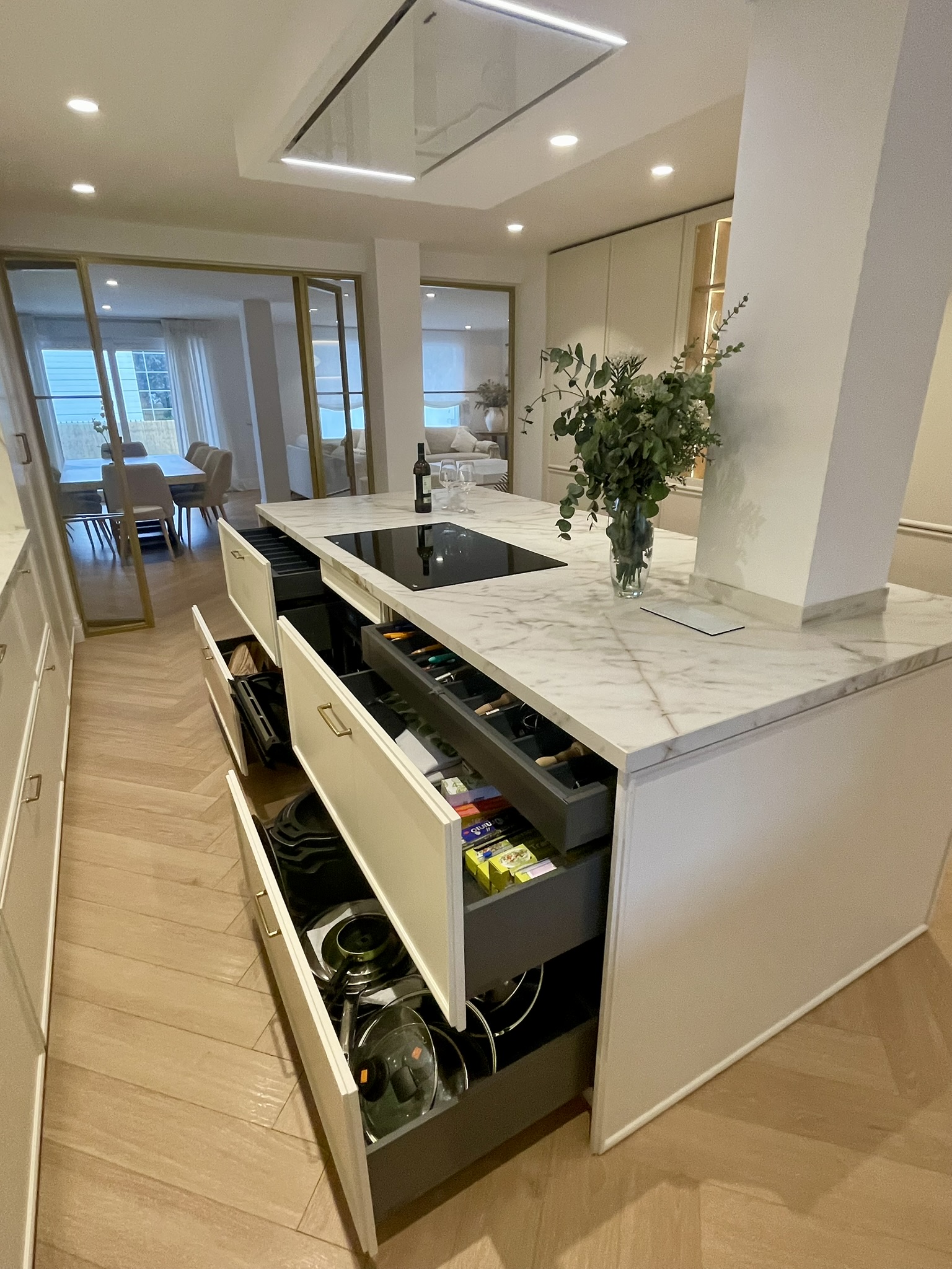 El mobiliario elegido es de alta gama, acabado en un lacado mate color nácar, con moldura perimetral en el mismo tono. Sus interiores, en cálida madera de roble claro, aportan profundidad y elevan visualmente todo el conjunto. Este tono se ha utilizado especialmente en la zona del desayunero, donde el diseño en madera se remata con una precisión exquisita. Los cajones y gavetas cuentan con guías de alta calidad con cierre amortiguado de la marca Blum, que aseguran suavidad y durabilidad en cada apertura.