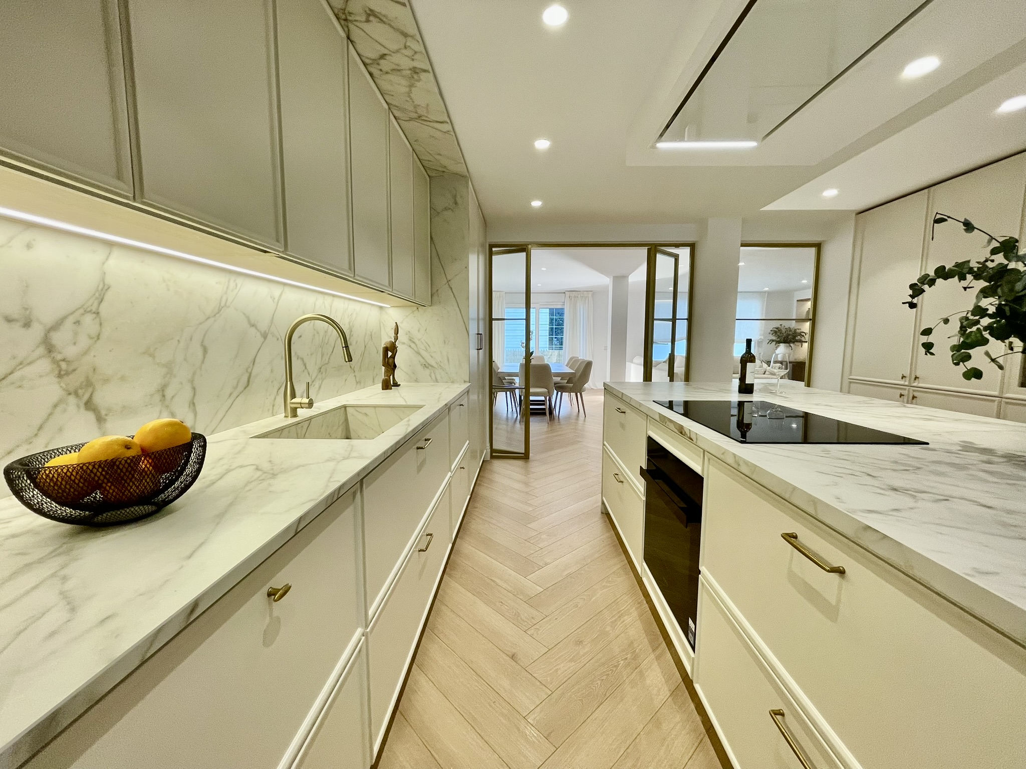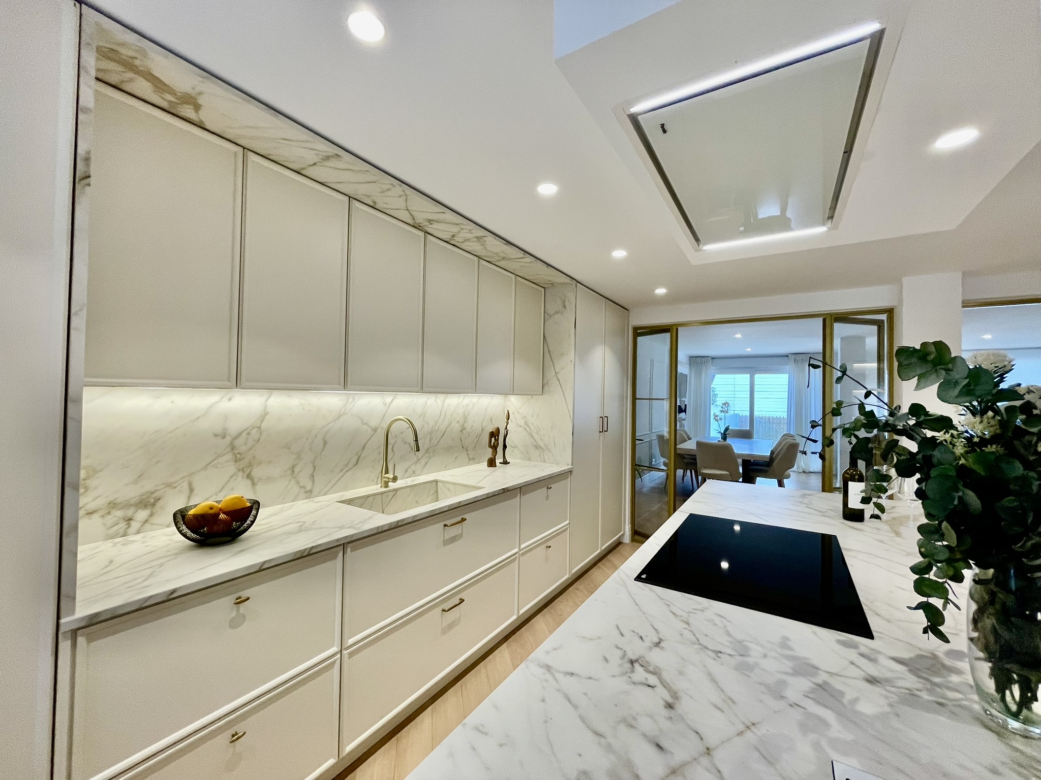 En cualquier proyecto de interiorismo, el verdadero éxito se alcanza cuando el diseño se adapta con precisión tanto a las condiciones del espacio como a las necesidades y gustos del cliente. Esta cocina es un ejemplo perfecto de ello: un espacio donde la estética contemporánea se fusiona con un concepto clásico y equilibrado, dando como resultado un ambiente distinguido y perfectamente integrado en el resto de la vivienda. Su paleta de colores neutros, cuidadosamente elegida, refuerza la sensación de serenidad y continuidad visual.