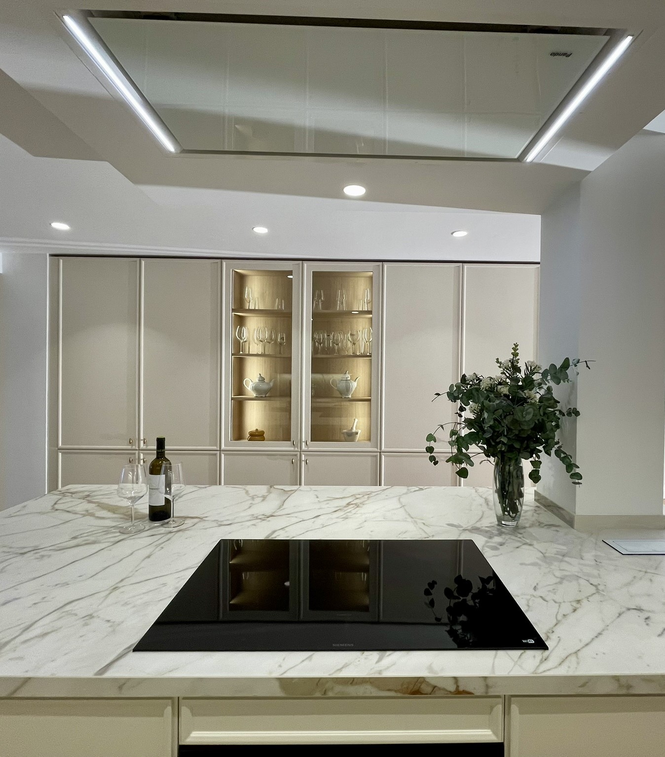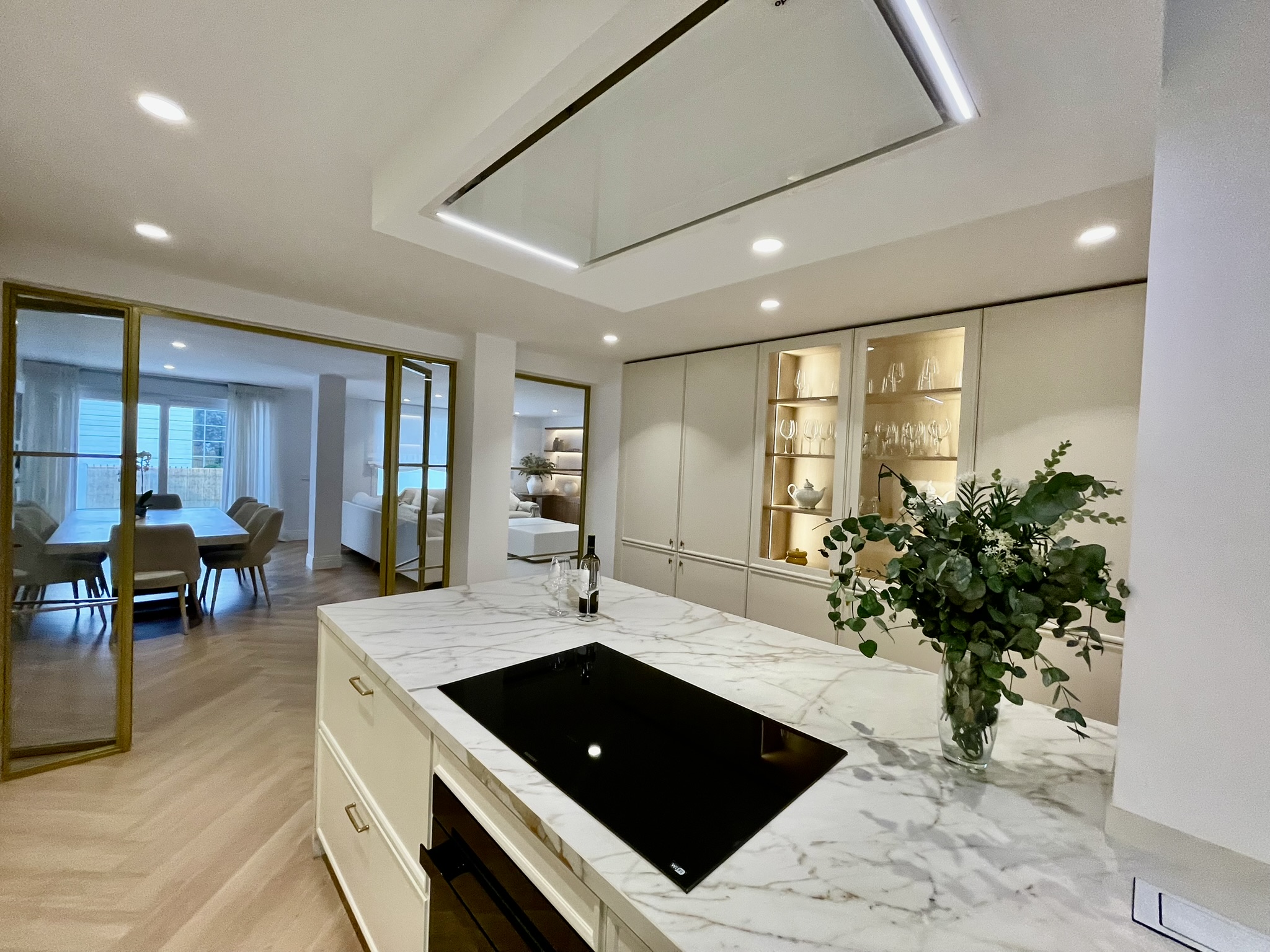 La cocina se articula en diferentes zonas que conviven en armonía. En el centro, la gran protagonista es una amplia isla que incorpora la placa de cocción y una campana suspendida elegantemente desde el falso techo. Esta pieza no solo cumple una función técnica impecable, sino que también actúa como elemento separador, delimitando dos ambientes: una zona más operativa, destinada a cocinar, lavar y preparar alimentos, y otra más social, compuesta por una barra que invita a compartir, conversar y disfrutar. A un lado, una vitrina iluminada con tiras LED a ambos extremos aporta un toque sofisticado y se convierte en un punto focal destinado a lucir la vajilla.